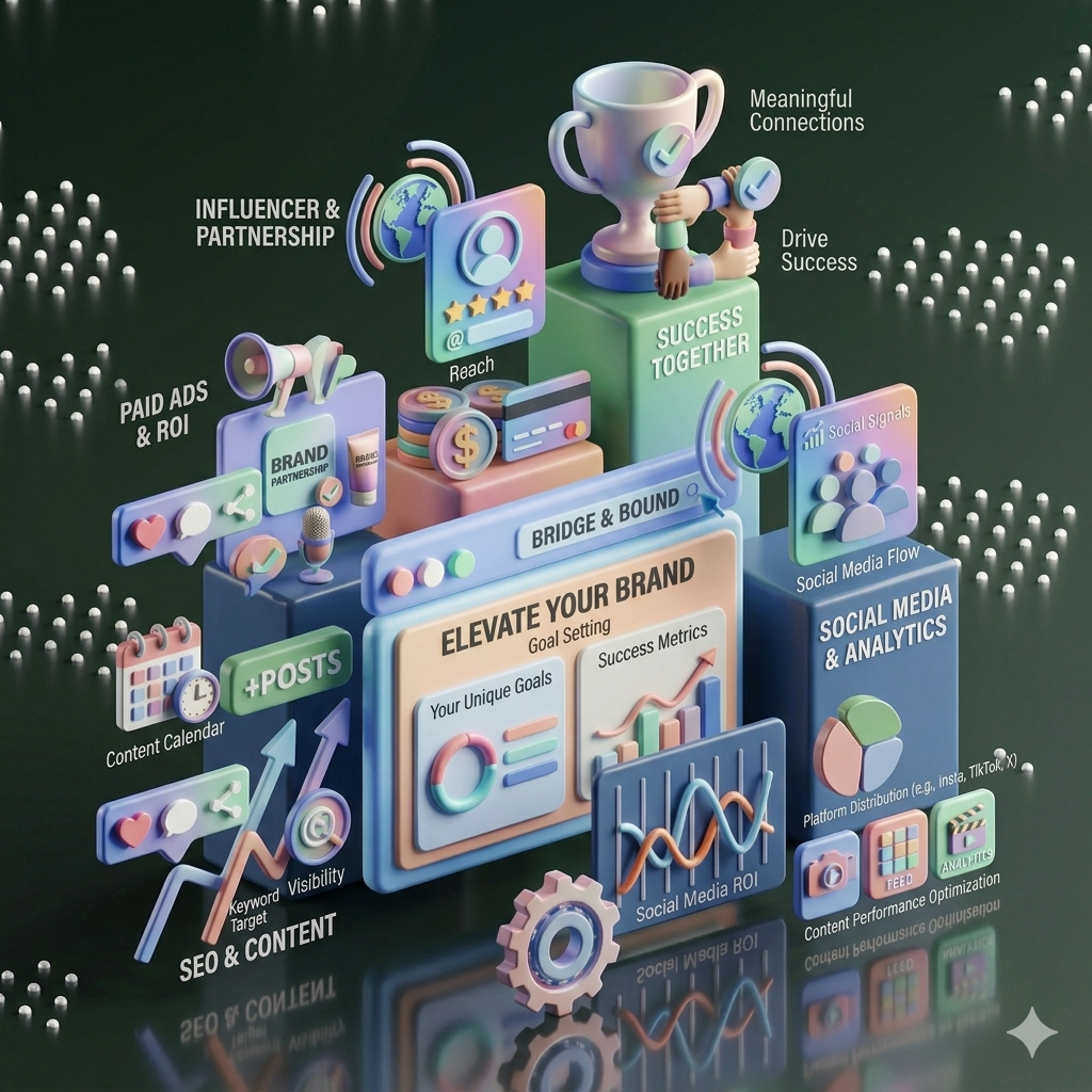 At Bridge & Bound, we focus on your unique goals. Our tailored strategies in SEO, paid ads, influencer marketing, and social media ensure your brand stands out. Together, we can create meaningful connections that drive success!